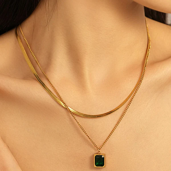 Gold-Plated Anti Tarnish Green Emerald Geometric Layered Necklace